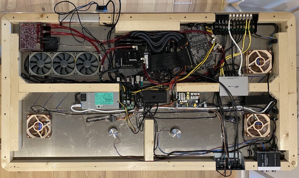 The configuration is quite simple: the three brown fans take air from outside and push it into the “case”; the 3 darkgreen fans move the air from inside, through the radiator out of the table-case. With a water circuit to move the heat from the CPU and GPU to the radiator, the loop is completed. I added a corsair commander to control all 6 fans independently and have temperature sensors in different places: air intake, air exhaust, near PSU, etc…